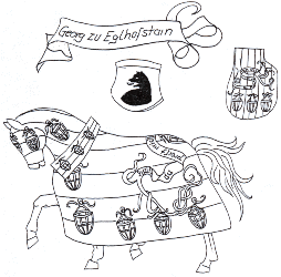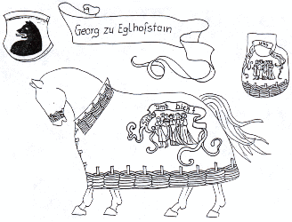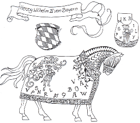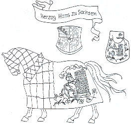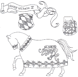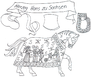 Auf dem Rückteil des Sackes ist ein Ritter im silbernem Harnisch mit einer Schale in der Hand, auf welcher ein “I” liegt abgebildet. Auf der Brustdecke - eine Dame (Jakobäa) im Goldbrokatkleid, ebenfalls eine Schale tragend, worauf ein “W” (Wilhelm) liegt.