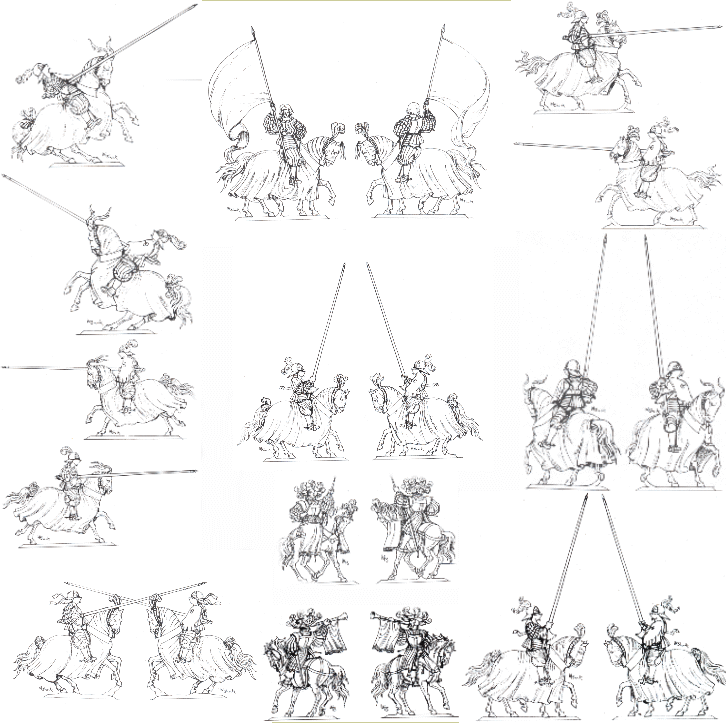 Die Figuren sind an Burgmeiers “Triumpfzug Kaiser Maximilians” angelehnt. Sie stellen Turnierritter zum Rennen um 1500 dar. Mit diesen Figuren lassen sich Einzüge und Turniere darstellen.
