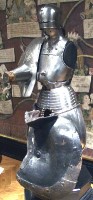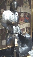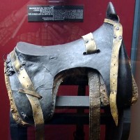 Die Renntartsche: Sie ist von Holz, an den Rändern unterhalb mit Eisenblech verstärkt und mit geschwärztem Kalbsleder überzogen. Um bequem an die Rennbrust befestigt werden zu können, schmiegt sie sich in ihrer Form ganz der Form der Brust und linken Schulter an und ist nur am Unterrande etwas nach vorne gebogen. Ihre Größe ist, je nach Art ihrer Verwendung verschieden. Im Schweif- oder Bundrennen reicht sie nur bis an den Hals, während sie beim Anzogenrennensich bis zum Sehspalt des Rennhutes erstreckt. Bei allen Rennen, wo die Stechtartsche beim Stoße nicht mit einem “Geschift” versehen ist, erscheint sie in der Regel mit Stoff in der Farbe und mit den Emblemen der Roßdecke überzogen.
