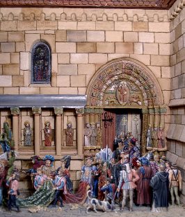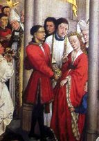 Die “Verlobung” meint ursprünglich das eigentliche Heiratsgelöbnis,das heißt den Handschlag des Paares vor den Verwandten und das Anstecken der Ringe. Altarbilder, namentlich des 15. Jahrhunderts, zeigen immer häufiger die Vermählung Mariens, in der Verlöbniss und Heiratsakt zusammenfallen; das Zusammenlegen der Hände des Paares segnet der Geistliche.