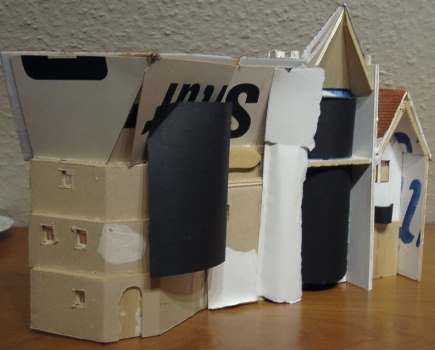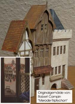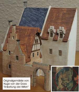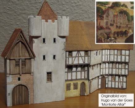 Als Vorlage für die Häusergruppen habe ich Abbildungen mittelaterlichen Bilder gewählt. Da im Mittelalter meist religiöse Themen in damals reale Umgebungen eingegliedert wurden, kann man solche Gebäude durchaus kopieren. Die Bilder im unteren Bereich haben kleine Abbildungen, die als Vorlagen dienten. Es sind verschiedene Häuser, die ich wahlos zusammengestellt habe.