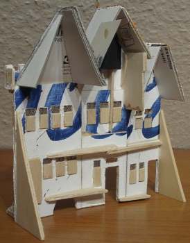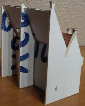Die untere Reihe von Bildern zeigt die Häuserfronten von der Rückseite. Wie man erkennen kann, sind die Fassaden aus dünnem Sperrholz und die Details wie z.B. Fensterläden aus Balsaholz. Die Dächer sind nach einer speziellen Methode selbst gestaltet. Diese Technik hat mir Herr Fred Prübenau gelehrt. Wie man diese herstellen kann werde ich in einem späteren Bericht zeigen.