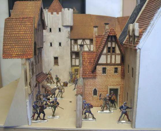 Zu diesem Diorama wurde ich durch die Zinnfigurenserie “Plünderung von Lüttich” von der Offizinn Lehnart inspiriert. Da sämtliche Figuren in diesem Diorama von Herrn Dr. Lehnart herausgegeben werden, hatte ich mich entschlossen auch nur diese Figuren zu verwenden. Großteils wurden erst die Figuren bemalt. Dann erst widmete ich mich der Gestaltung und Anordnung der Gebäude. Da ich wie immer nur Bühnenfassaden baue, habe ich die Gebäude so angeordnet, daß der Betrachter seine Blicke schweifen lassen muß, um alle Figuren betrachten zu können. Hierfür bieten sich die engen und verwinkelten Gassen mittelalterlichen Städte an.